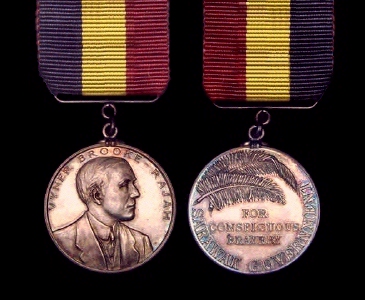 The Sarawak Government Conspicuous Bravery Medal: instituted by Rajah Sir Charles Vyner Brooke to recognise and reward supreme acts of conspicuous bravery by members of the Sarawak Rangers, Sarawak Police and government servants. Later extended to Sarawak subjects and other civilians to cover actions during the Japanese occupation. Awarded in a single class, a circular silver medal. Obsolete 1946.
