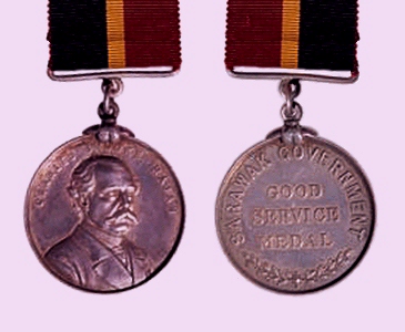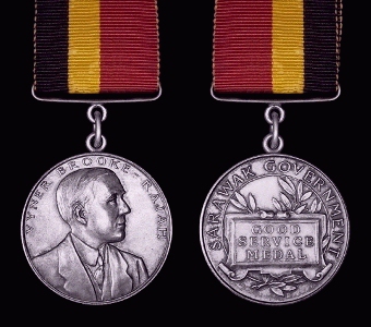 The Sarawak Government Good Service Medal (civil): instituted by Rajah Sir Charles Johnston Brooke to recognise meritorious services and distinguished service by Sarawak subjects and employees in government service. Modified and re-designed by Rajah Sir Charles Vyner Brooke in 1928 and thereafter restricted to civil servants and meritorious services of a civil nature. Awarded as a circular medal in two classes (1. First Class in silver, and 2. Second Class in bronze). Obsolete 1946.