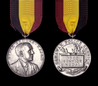 The Sarawak Police Service Good Service Medal: instituted by Rajah Sir Charles Johnston Brooke in 1928 to recognise meritorious and distinguished service by officers and men of the Sarawak Police and Armed Constabulary. Awarded as a circular medal in a two classes (1. First Class in silver, and 2. Second Class in bronze). Obsolete 1946.