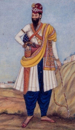 1783 – 1840 Barar Bans Sarmur, Raja Jaswant Singh, Malvendra Bahadur, Raja of Nabha. b. at the Fort, Nabha, 1775, eldest son of Sardar Hamir Singh Sahib, Rais of Nabha, by his third wife, Sardarni Raj Kaur Sahiba, educ. privately. Succeeded on the death of his father as Rais-i-Azam of Nabha, December 1783. Ascended the gadi and formally installed, at the Fort, Nabha, January 1784. Assumed the title of Raja. He entered into engagements of alliance and protection with Lord Lake against the Marathas 26th May 1804. Nevertheless, remaining a weary ally of Ranjit Singh during his 1807 invasion of the Cis-Sutlej, from whom he receive four villages of the annexed Ghumgrana estate. In 1818 he accepted a further eighteen villages in Kannah, seized by the Maharaja from Rani Raipuri and Ran Singh. He renewed the British alliance with General Sir David Ochterlony 4th February 1809, and came under the permanent protection of the HEIC by virtue of the Treaty of Lahore 23rd April 1809 (confirmed by the Proclamation of the Governor-General dated 3rd May 1809). Granted the hereditary titles of Barar Bans Sarmur and Malvendra Bahadur by the Emperor Muhammad Akbar Shah, 26th September 1810. Received a sanad from the Governor-General confirming him in his possessions, 20th November 1810. Mbr Council of Advisors to the Maharani of Patiala 1811-1823. Firm in his compact with the British, he rendered assistance with supplies and carriage during the Gurkha campaign 1810, Bikaner 1818, and the march to Kabul in 1838. m. (first) (sep) Rani Sri Daya Kaur Sahiba, daughter of Sardar Jai Singh, of Lidhran and Dahedu. m. (second) H.H. Rani Sri Mai Chand Kaur, Regent for her step grandson 18th September 1846 - October 1856, daughter of Sardar Ram Singh Dhillon. m. (third) Rani Sri Ram Kaur Sahiba, daughter of Sardar Bagh Singh Rallon. m. (fourth) at Nabha, 1820, Rani Sri Har Kaur Sahiba, daughter of Sardar Hari Singh Jodhpuria. m. (fifth) Rani Sri Dharam Kaur Sahiba, daughter of Sardar Sujjan Singh, of Ghumon. He d. at the Fort, Nabha, 21st May 1840, having had issue, three sons: