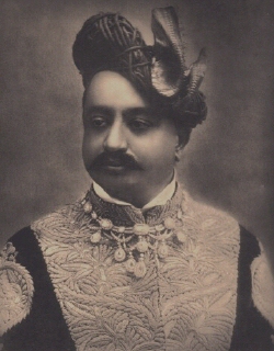 1897 - 1915 H.H. Maharana Shri Sir Chhatrasinhji Gambhirsinhji Sahib, Raja of Rajpipla, KCIE (12.12.1911). b. at Nandod, 18th December 1862, eldest son of H.H. Maharana Shri Gambhirsinhji Verisalji Sahib, Raja of Rajpipla, by his first wife, H.H. Maharani Shri Rupalibakunverba Sahiba, educ. Rajkumar Coll, Rajkot. Magistrate 3rd class 1889, Magistrate 2nd class 1889-1890, Special Revenue Officer and Magistrate 1st class for Jhaghadia taluqa 1891-1895 and for Nandod and Gardeshwar taluqas 1895-1897.Succeeded on the death of his father, 10th January 1897. Installed on the gadi at the Fort, Rajpipla, 20th May 1897. Instrumental in saving thousands of lives during the epic famines of 1899-1902, granting famine relief during this period amounting to nearly Rs 8 lakhs. Visited England and Europe in 1897, 1904, 1906, 1909, and 1911. Vice-President East India Assoc. Rcvd: Diamond Jubilee medal (1897), Delhi Durbar gold medals (1903 and 1911), and Coron medal (1911). m. (first) ... (d. at Chattra Niwas Palace, Nandod, 29th November 1890). m. (second) at Wankaner, H.H. Wankanerwala Maharani Shri Phoolkunverba Sahiba (d. Chattra Niwas Palace, Nandod, 20th November 1920), elder daughter of Maharana Raj Shri Banesinhji Jaswantsinhji Sahib, Maharana Raj Sahib of Wankaner. m. (third) at Chhota Udepur, 1892, H.H. Maharani Shri Sardarkunverba Sahiba (d. before 1911), second daughter of Rajaji Maharaol Shri Jitsinhji Maansinhji Sahib, Raja of Chhota Udepur. m. (fourth) H.H. Maharani Shri Manharkunverba Sahiba (d. at Nandod, 24th April 1958), daughter of Kumar Shri Durjansinhji Takhatsinhji Mahida, of Chandod, under Baroda. He d. of a sudden paralytic stroke, at Poona, Bombay Presidency, 26th September 1915, having had issue, four sons and four daughters: