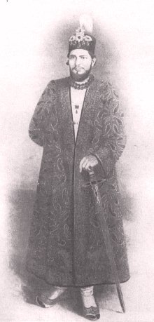 1887 - 1889 H.H. ‘Ali Jah, Farzand-i-Dilpazir-i-Daulat-i- Inglishia, Mukhlis ud-Daula, Nasir ul-Mulk, Amir ul-Umara, Nawab Muhammad Mushtaq ‘Ali Khan Bahadur, Mustaid Jang, Nawab of Rampur. b. 1856, fourth son of H.H. ‘Ali Jah, Farzand -i-Dilpazir-i-Daulat-i-Inglishia, Mukhlis ud-Daula, Nasir ul-Mulk, Amir ul-Umara, Haji Nawab Sir Kalb-i-‘Ali Khan Bahadur, Mustaid Jang, Nawab of Rampur, GCSI, CIE, by his first wife, H.H. Nawab Hatim uz-Zamani Nizami Begum Sahiba, educ. privately. Succeeded on the death of his father, 23rd March 1887. Installed by the Lieutenant-Governor in person, at the Khurshid Manzil, Qila-i-Mualla, Rampur, April 1888. Confirmed in the hereditary salute of 13-guns and the style of His Highness, 8th February 1889. Suffered from continual ill-health and entrusted state affairs to a Council of Administration. Rcvd: KIH silver medal (1877). m. (first) H.H. Nawab Askari Begum Sahiba, daughter of Sahibzada Syed Mubarak ‘Ali Khan (see above). m. (second) H.H. Nawab Khurshid Jahan Begum Sahiba (d. 9th September 1875), daughter of Syed Inayat Hasan Khan [Inna Mian], by his wife, Sahibzadi Kulsum Begum Sahiba [Manjali Begum], daughter of Nawab Kazim ‘Ali Khan Bahadur. He d. at the Macchi Bhawan, Qila-i-Mualla, Rampur, 25th February 1889, having had issue, two sons:
