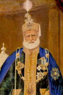 1921 - 1935 H.H. Huzur Pur Nur, Sarkar-i-Khairpur, Mir 'Ali Nawaz Khan Talpur al-Haj, Wali-i-Mulk-i-Khudadad, Mir of Khairpur. b. at Khairpur Mirs, 9th August 1884, eldest son of Lieutenant-Colonel H.H. Huzur Pur Nur, Sarkar-i-Khairpur, Nawab Mir Sir Imam Bakhsh Khan Talpur, Wali-i-Mulk-i-Khudadad, Mir of Khaipur, GCIE, educ. Aitchison Coll., Lahore, and with the Imperial Cadet Corps, Dehra Dun. Appointed as Heir Apparent and invested with the title of Wali Ahad, 1910. Represented his father at the Coronation of the King-Emperor George V and the Queen-Empress Mary at Westminster Abbey in London 1911. Succeeded on the death of his father, 8th February 1921. Ascended the musnaid, at Faiz Mahal, Khairpur Mirs, 9th February 1921. Installed there by the British Agent, 25th February 1921. Forced to surrender administrative control over the state, on account of the diastrous management of the state, June 1931. Presdt All-India Shia Conference 1928, and All-India Baloch Conference 1932. Rcvd: King George V Coron (1911 with Durbar clasp) and Silver Jubilee (1935) medals. m. (first) a lady from the Talpur clan (d.s.p.). m. (second) H.H. Dera Khas Sahiba [Dera Kalan] (d. at Faiz Mahal, Khairpur Mirs, 1937). m. (third) a lady from Lahore. He d. at Faiz Mahal, Khairpur Mirs, 25th December 1935 (bur. Qadir Bakhsh Ja Quba), having had issue, two sons: