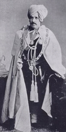 1856 - 1898 H.H. Shri Raja Sir Shamsher Prakash Bahadur, Raja of Sirmur, GCSI (15.2.1887, KCSI 31.12.1875). b. at Nahan, 1845, elder son of Shri Raja Raghubir Prakash Bahadur, Raja of Sirmur, by his second wife, Shri Hathioli Rani Deviji Sahiba, educ. privately. Succeeded on the death of his father, 20th June 1856. Ascended the gadi at the Shish Mahal, Nahan, 18th January 1857. Installed by the Lieutenant-Governor, at Nahan, 4th July 1857. Reigned under a Council of Regency until he came of age. Invested with full ruling powers, 18xx. Mbr of the Imperial Legislative Council in Calcutta. Rendered loyal services during the Indian Mutiny in 1857, in recognition of which he received a khilat and a permanent salute of 7-guns 1857. Raised to a permanent salute of 11-guns and granted the hereditary style of His Highness 1867, and later prom to a personal salute of 13-guns 1886. He sent contingents of state troops to serve in the Second Afghan War of 1880, and the Tirah expedition of 1897. He took a keen personal interest in the administration and was a strict disciplinarian, who severely checked bribery and corruption amongst his officials, cleanliness and order amongst his subjects. He also constructed water works for clean, pure water and promoted medical facilities and good health practices. He also reformed the entire legal system, instituting a modern civil and criminal code, a modern judiciary and court procedures. Mbr North Punjab Fishing Club. Rcvd: the Prince of Wales's (1876) and KIH (1877) gold medals. m.(first) at Koenthal, 18xx, H.H. Shri Koenthali Rani Talab Deviji Sahiba (d. at Nahan Palace, 18xx), daughter of Raja Shri Mahendra Sen Bahadur, Raja of Keonthal. m.(second) at Koenthal, H.H. Shri Koenthali Rani …Deviji Sahiba, younger daughter of Raja Shri Mahendra Sen Bahadur, Raja of Keonthal. m.(third) H.H. Shri Kunhari Rani Deviji Sahiba, younger daughter of Thakur Kishen Singh, Thakur of Kunihar, near Simla. He d. from a paralytic stroke, at Shamsher Villas, Nahan, 2nd October 1898, having had issue, two sons: