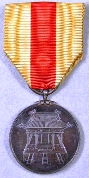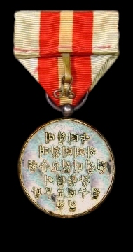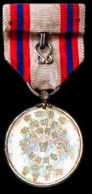 - Enthronement Commemorative Medal: instituted by Emperor Yung-hui to commemorate his enthronement on 27th August 1907. Awarded as a circuler medal in three classes (1. First Class in solid gold – limited to the Imperial Family, 2. Second Class in solid silver – conferred on nobles and those of officer rank, and 3. Third Class in bronze – commoners, junior officials and other ranks). Ribbon: 38mm in puce moiré with two 9mm stripes of red/blue/red towards each edge.