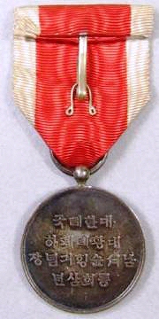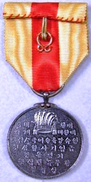 - Emperor Kwangmu Forty Year Reign Commemorative Medal: instituted by Emperor Kwangmu to commemorate the fortieth anniversary of his accession on 18th October 1902, according to the Korean reckoning. Awarded as a circuler medal in three classes (1. First Class in solid gold – limited to the Imperial Family, 2. Second Class in solid silver – conferred on nobles and those of officer rank, and 3. Third Class in bronze – commoners, junior officials and other ranks). Ribbon: 37mm moiré, yellow divided by a 12mm red stripe down the centre.