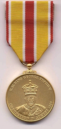 King George Tupou V Coronation Medal (Metali Fakalangilangi ‘o e Hilifaki Kalauni ‘o ‘Ene ‘Afio, Siaosi Tupou V): instituted by King George Tupou V 31st July 2008 to commemorate his coronation. Awarded in a single grade, a frosted gilt medal.