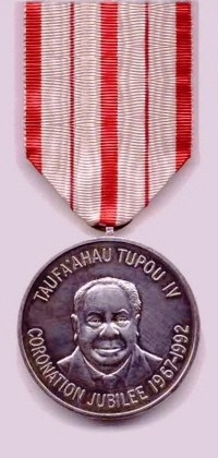 King Taufa’ahau Tupou IV Coronation Silver Jubilee Medal (Metali Fakalangilangi ‘o e Siupeli Siliva ‘o e Hilifaki Kalauni ‘o ‘Ene ‘Afio Taufa’ahau Tupou IV): instituted by King Taufa’ahau Tupou IV on 4th July 1992 to commemorate the 25th anniversary of his coronation in 1967. Awarded in a single grade, a circular silver medal.
